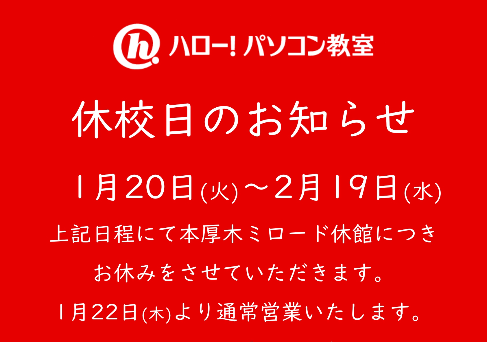 ハロー!パソコン教室本厚木ミロード校も休校となります